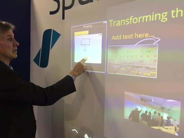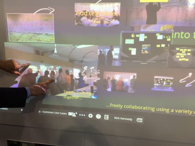 Guess Barney and I are classroom teachers at heart, so no surprise that in this age of online learning, our first stop was at a tool which can enrich the classroom, originally derived from the Smartboard. Nureva Span was the first piece of kit which caught our eye – a kind of ‘interactive wall’ which operates with a ceiling-mounted data-projector. The working surface is three metres wide, and you can scroll along a 40 foot canvas, add text and screen shots.