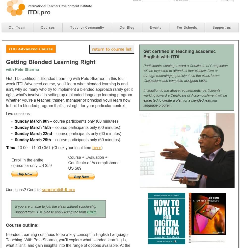 You can get iTDi certified in Blended Learning in this four-week iTDi Advanced course. You’ll learn what blended learning is and isn’t, why so many who try to implement a blended approach rarely get it right, and what’s involved in setting up a blended language learning program. Whether you’re a teacher, trainer, manager or principal you’ll learn how to build a blended program that’s just right for your particular context.