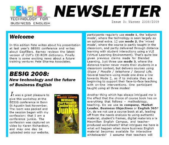 We have just mailed out the latest Newsletter. It contains articles on BESIG Bonn, the latest electronic dictionary from CUP and news about PSA (Pete Sharma Associates).